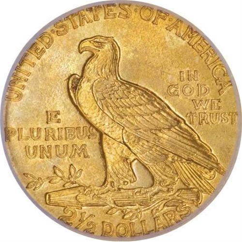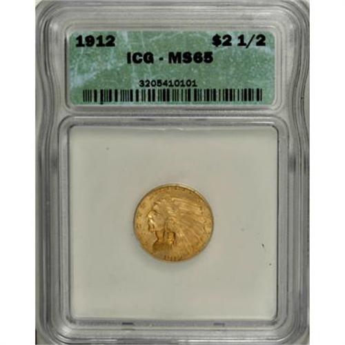 <B>1912 $2 1/2 MS65 ICG.</B></I> Considered a common date in all grades through MS63, the 1912 is elusive in MS64 quality, and an important condition rarity in Gem preservation. Both sides have excellent surfaces with sharp design elements, attractive pale blue toning over honey-gold color, and frosty luster that is only interrupted by a few insignificant marks.<BR><BR><B>Coin Engraver:</B> Bela Lyon Pratt<BR><BR><b>Shipping:</b> Coins & Currency (<a target="_blank" href="http://www.heritageauctions.com/common/shipping.php">view shipping information</a>\)