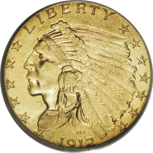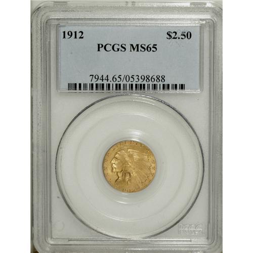 <B>1912 $2 1/2 MS65 PCGS.</B></I> True to most issues in the series, the 1912 can be located without too much cost or difficulty in average Uncirculated condition, with a quick check of census data from the two major services revealing that over 4,000 pieces have been certified in Mint State grades. Of course, the availability of Gem examples nearly drops off the radar screen.<BR> This lovely representative exhibits bright satin-like surfaces and is accented in delicate copper-golden patina. Both sides exhibit a sharp strike with good detailing even on the lower feathers of the headdress. A couple of small marks are noted above the feathers in the obverse field, however, these hardly detract. Population: 48 in 65, 5 finer (11/06).<BR><BR><b>Shipping:</b> Coin/Currency (<a target="_blank" href="http://www.heritageauctions.com/common/shipping.php">view shipping information</a>)