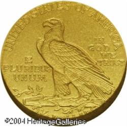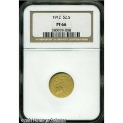 1912 $2 1/2 PR66 NGC. The official mintage for thi <B>1912 $2 1/2 PR66 NGC.</B></I> The official mintage for this date of 197 proofs could give one the impression of greater availability than is actually the case. Attrition was very heavy in this year also, and the original mintage figure bears no relationship to the actual number of survivors today. Akers was only able to trace 19 auction records for this date in the thirty years he surveyed for his work. The actual number of survivors is probably in the neighborhood of 50-75 pieces, but only a small handful are known in Gem (and finer) conditions. <BR> The matte or sandblast finish was used on gold proofs of this year, but the texture of this coin is markedly different than that on the 1908-11 proofs. This piece features fine grain surfaces that sparkle with thousands of tiny individual granules. The obverse is virtually flawless. If one looks close enough on the reverse there are a couple of tiny marks in the field above the eagle. These are barely perceptible to the unaided eye, and obviously have little affect on the coin's grade or overall attractiveness as evidenced by the Proof 66 designation. Population: 15 in 66, 6 finer (10/04). <BR><BR><B>Important notice:</B> Heritage usually auctions material at the rate of 200-250 lots per hour. On some occasions eBay Live bid software or the Internet may not be able to keep up with the pace of the auction. We recommend placing a realistic absentee bid now as insurance to avoid disappointment. Occasionally the auctioneer may eliminate or reject an eBay Live bid, and the auctioneer may also reopen a lot after the close of the eBay live bidding (usually because we missed an audience bid), and may reject your bid even if it shows you as the winning bidder. By bidding via eBay Live, you agree that Heritage may award the lot to another bidder at its sole discretion under the circumstances described above or any other reasonable circumstances. Since eBay bids are not shown to us until we open the lot on the floor, we treat those bids just like floor bids. In most cases the floor responds before the eBay bid is presented to us, due to Internet lag time, so for consistency we have made it a policy that floor bids are always considered first over tie eBay live bids. Also please note that all Heritage lots purchased through eBay Live carry a 20% Buyer's Premium. Please make sure you read the Terms and Conditions before you bid. This lot is being auctioned in conjunction with a live floor auction by Heritage Galleries & Auctioneers. All final auction and invoice information will be supplied by Heritage Galleries & Auctioneers, and all other information should be considered preliminary. Lot:6588