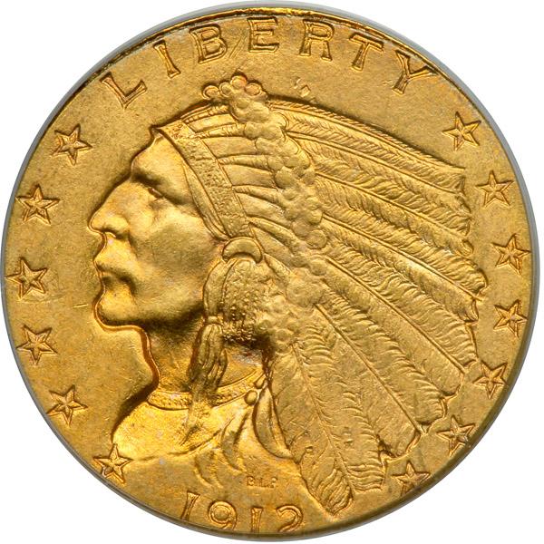 1912 $2.50 Indian. PCGS graded MS-65. A hint of light tone along with soft, satiny luster throughout. Some of the lower feather ends not complete in their finer detail, but the upper portion of the bonnet is finely detailed. 1912 is the year the stricken cruise ship Titanic hit an iceberg and sank (April 15). Pop 54; 5 finer in 66 (PCGS # 7944) .