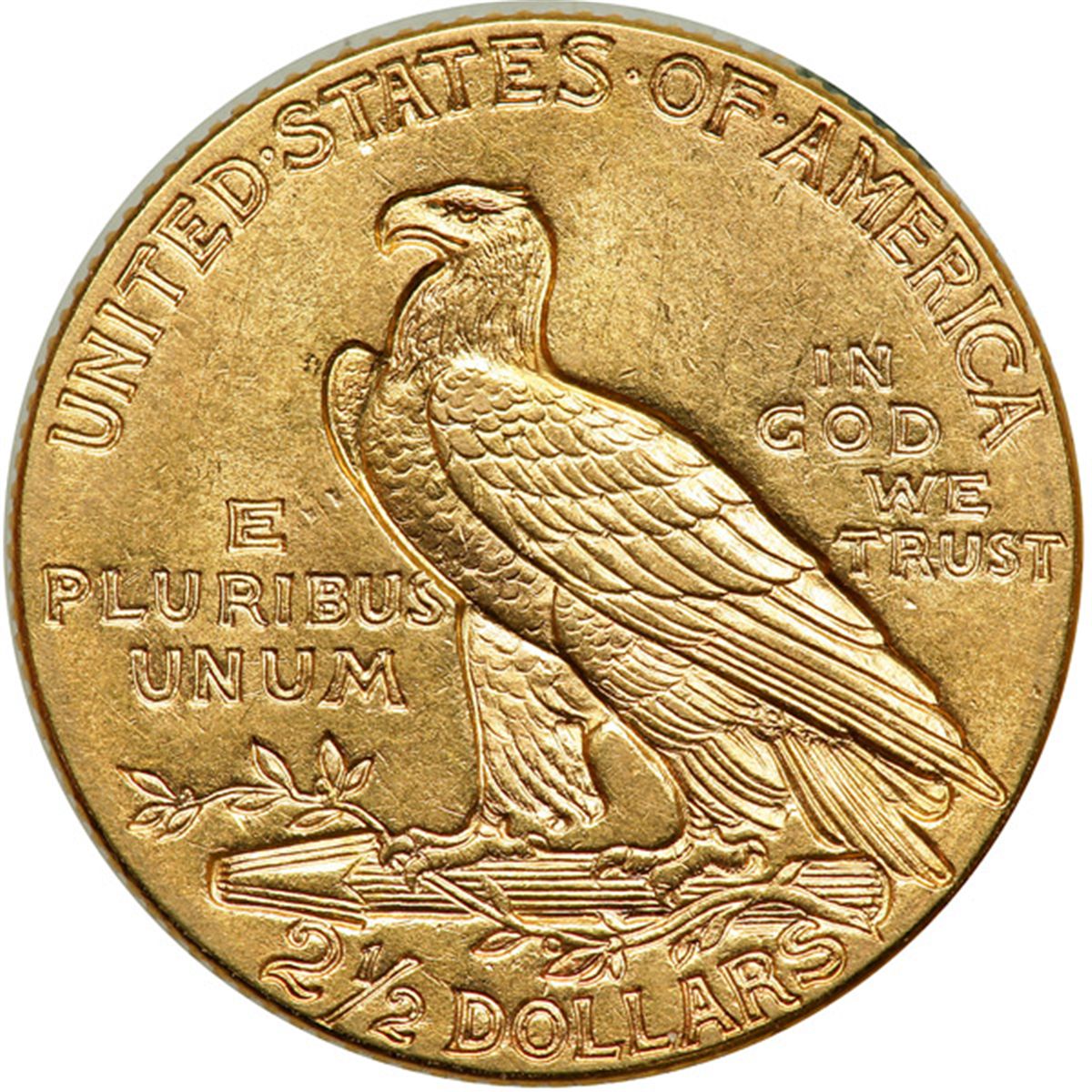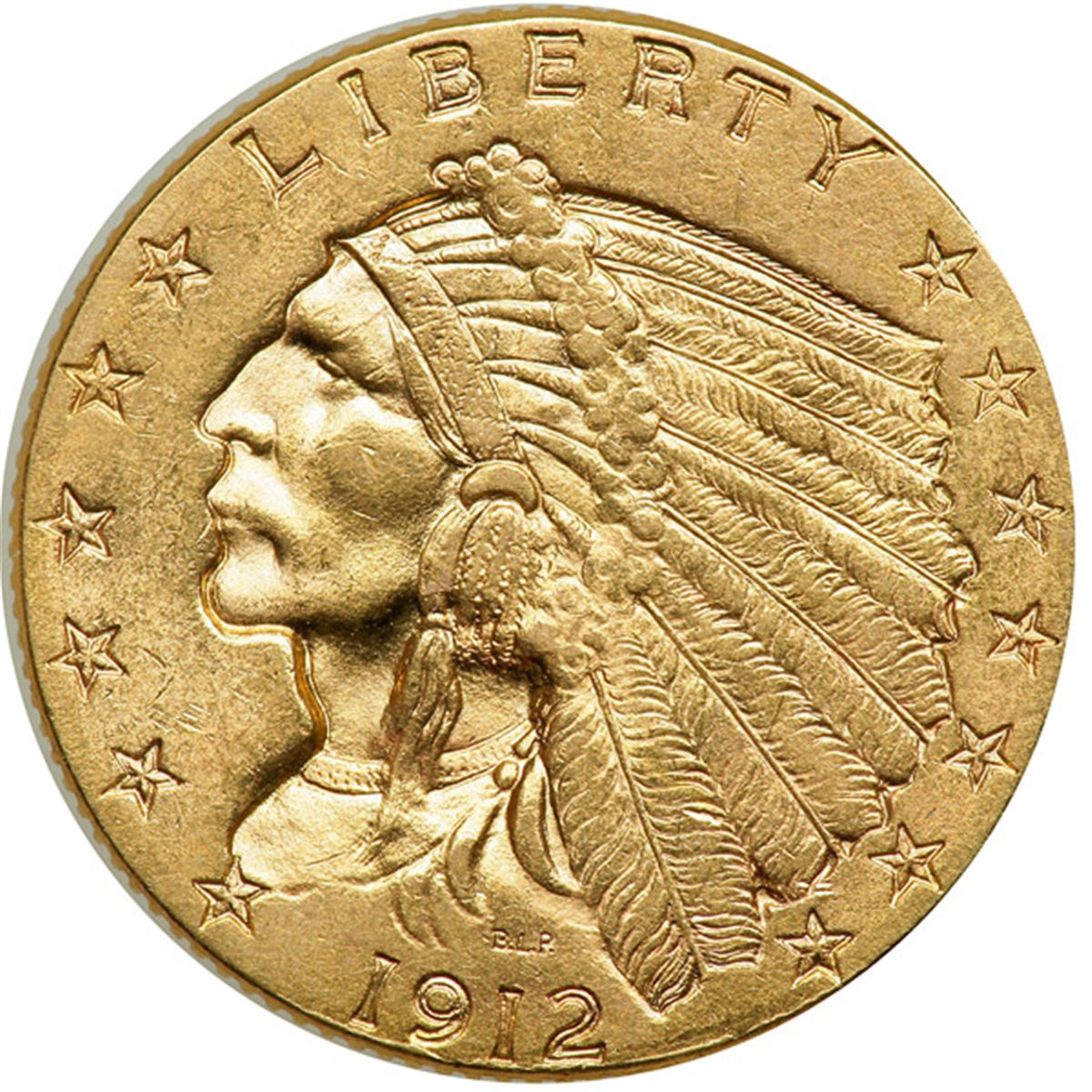 1912 $2.50 Indian. AU-58. Coin has extensive luster and very choice surfaces. 1912 is the year Titanic hit an iceberg and sank.