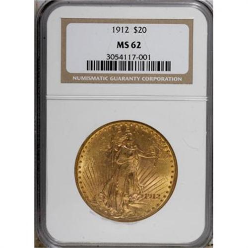 <B>1912 $20 MS62 NGC.</B></I> NGC Census: (762/450). PCGS Population (794/1163). Mintage: 149,700. Numismedia Wsl. Price for NGC/PCGS coin in MS62: $800. (#9160)<BR><BR><B>Coin Engraver:</B> Augustus Saint-Gaudens<BR><BR><b>Shipping:</b> Coins & Currency (<a target="_blank" href="http://www.heritageauctions.com/common/shipping.php">view shipping information</a>)