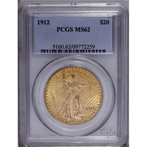 <B>1912<$20> MS62 PCGS.</B></I> Honey-gold surfaces display some interruption in the luster flow from several light contact marks scattered about. Most of the design elements are adequately brought up.