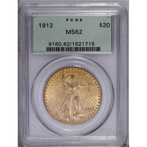 <B>1912<$20> MS62 PCGS.</B></I> This lustrous older holder example has its share of small marks, but is nicely struck and represents a lower mintage issue. A small dig is noted above Liberty's right (facing) elbow.