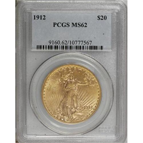 <B>1912 $20 MS62 PCGS.</B></I> Yellow-gold save for a few russet freckles along the right reverse border. The left obverse field has a few minor marks, but this shimmering example will represent this lower mintage issue.<BR><BR><b>Shipping:</b> Coins & Currency (<a target="_blank" href="http://www.heritageauctions.com/common/shipping.php">view shipping information</a>)