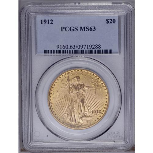 <B>1912<$20> MS63 PCGS.</B></I> This lower mintage double eagle is satiny and well struck. Crisply struck, and no heavy marks are located. No branch mint double eagles were struck in 1912, the first such occurrence since the San Francisco Mint opened in 1854.