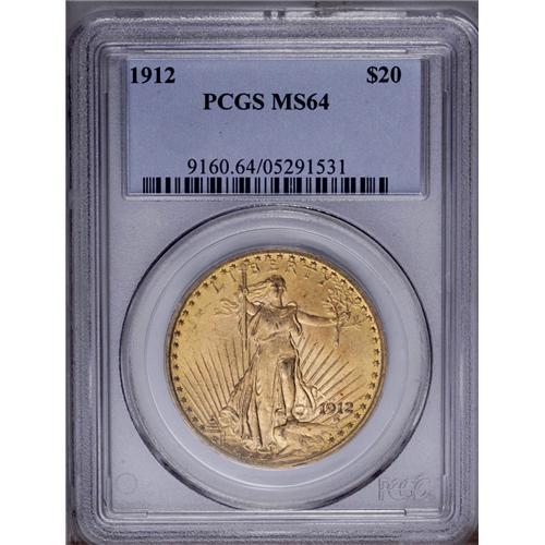 <B>1912<$20> MS64 PCGS.</B></I> Both sides of this attractive, reddish-gold and golden-rose example are temptingly close to a full Gem grade. Words cannot adequately describe the awe-inspiring eye appeal of this frosty example, and we recommend first-hand inspection. A smooth double eagle that is sure to elicit numerous strong bids. Like most of the other P-mint issues in the early Saint-Gaudens series, the 1912 (149,824 pieces) is difficult to locate in finer Mint State grades.