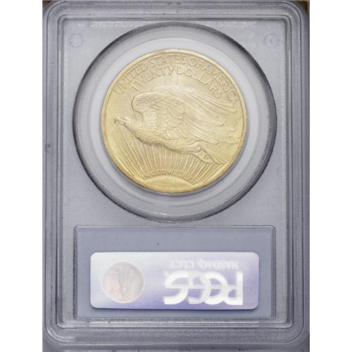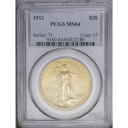 <B>1912<$20> MS64 PCGS.</B></I> Bright and satiny with pleasing green-gold and pink toning and bold striking details. A few scattered abrasions, mostly on the obverse, preclude a Gem grade assessment. As befits the limited original mintage of fewer than 150,000 pieces, the 1912 is a conditionally scarce issue that is infrequently offered at the MS64 level of preservation.