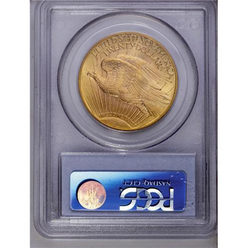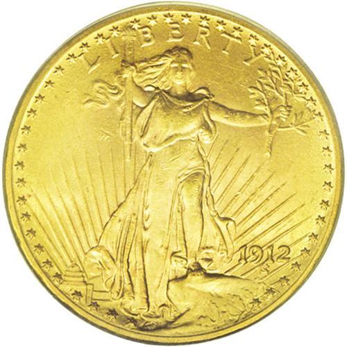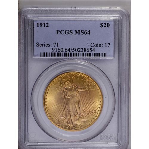 <B>1912<$20> MS64 PCGS.</B></I> Walter Breen (1988) notes that 1912 double eagles are "...often weakly struck or extensively bagmarked, seldom choice." Not so on the near-Gem offered here. The design elements are sharply impressed, and reveal crispness on the Capitol and on Liberty's face, fingers of the left (right facing) hand, and toes, and on the eagle motif. Moreover, while a handful of unobtrusive marks preclude full Gem status, they are not as extensive or severe as is often the case on specimens of this date. Lustrous surfaces reveal a delicate mix of apricot-gold and lime green color.