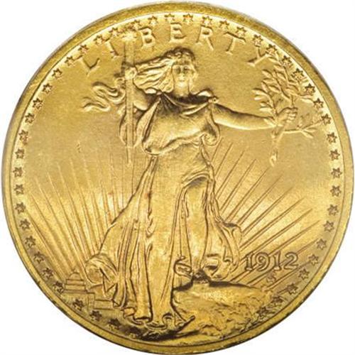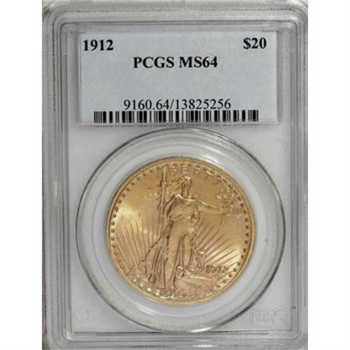 <B>1912 $20 MS64 PCGS.</B></I> The 1912 change from 46 stars around the obverse and the edge to 48 was executed with subtlety, and though the change created a distinct subtype for the Saint-Gaudens series, few collectors recognize the distinction today. This vibrant sun-gold Saint-Gaudens offers excellent luster and strong detail. Attractive with few abrasions, though one mark extends from the L in LIBERTY to the I. PCGS has certified only 31 pieces as Gems or better (7/07).<BR><BR><B>Coin Engraver:</B> Augustus Saint-Gaudens<BR><BR><b>Shipping:</b> Coins & Currency (<a target="_blank" href="http://www.heritageauctions.com/common/shipping.php">view shipping information</a>\)