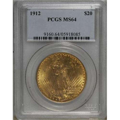 <B>1912 $20 MS64 PCGS.</B></I> The 1912 is part of a string of five low-mintage Philadelphia double eagle issues that began in 1911. This pleasing piece, primarily sun-gold with elements of peach at the upper obverse, is satiny and well-defined with few marks for the grade. Elusive any finer, with just 32 such pieces graded by PCGS (3/08).<BR><BR><B>Coin Engraver:</B> Augustus Saint-Gaudens<BR><BR><b>Shipping:</b> Coins & Currency (<a target="_blank" href="http://www.heritageauctions.com/common/shipping.php">view shipping information</a>)