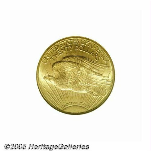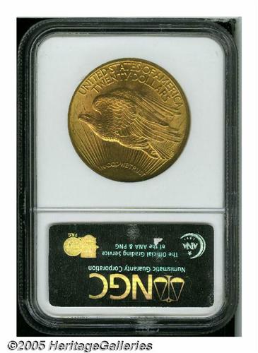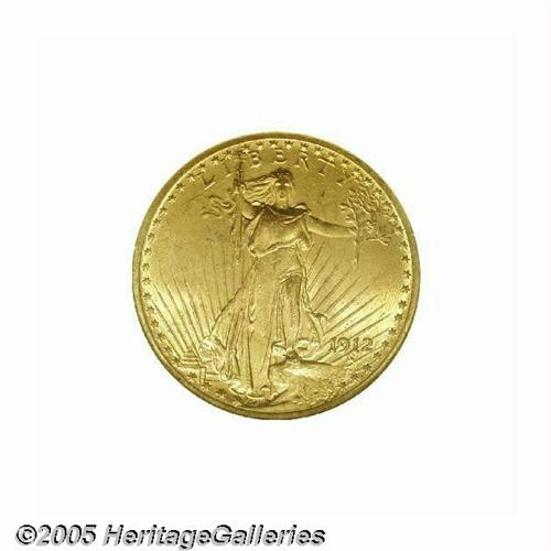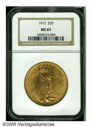 <B>1912<$20> MS65 NGC.</B></I> Although far more obtainable in AU and better condition, the small hoards of this issue that emerged from European sources over the past several decades have done surprisingly little to increase the availability of high grade 1912 Saint-Gaudens Twenties. The surfaces on this important MS65 example are exceptionally clean and are tinted in golden-orange hues. These natural colorations are enhanced by a vibrant, satiny luster. Just a hint of obligatory flatness is noted on Liberty's knee. A few degrees of clockwise die rotation is also noted. Population: 11 in 65, 3 finer (5/05).