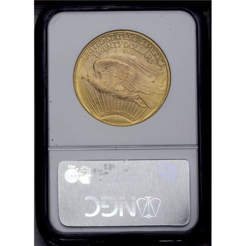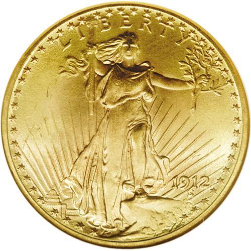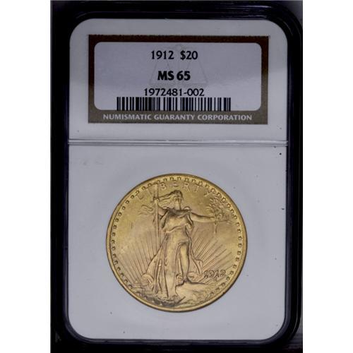 <B>1912<$20> MS65 NGC.</B></I> 1912 saw the second lowest mintage (behind 1886) of double eagles for any year since the denomination was introduced with the 1849 patterns. For only the second time since its 1854 opening, the San Francisco Mint produced no double eagles in 1912. The Denver Mint also bypassed the denomination, the first such omission since its opening in 1906. Philadelphia struck less than 150,000 double eagles in 1912, its lowest mintage since 1906. Despite its limited emission, the 1912 is available in bagmarked Mint State grades. However, Gems are seldom encountered, and the supply is insufficient to meet the demand from ambitious collectors of this highly popular series. This fully lustrous piece has a bold strike and an overall clean appearance. A moderate luster graze near 9 o'clock determines the grade.