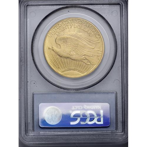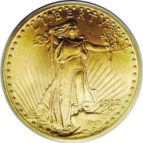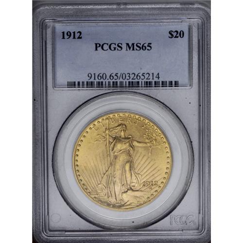 <B>1912<$20> MS65 PCGS.</B></I> Gold specialist David Akers indicates that the 1912 double eagle is the most common of the scarce Philadelphia Mint issues from 1908 to 1915. It is relatively available in Uncirculated grades through MS63. Near-Gem pieces are somewhat scarcer, and full Gem and finer examples are rare and seldom available. Akers' assertion is borne out by the PCGS and NGC population data. The two services combined have seen around three dozen MS65 specimens, and fewer than ten Premium Gem coins with none finer.<BR> The present Gem displays frosty honey-gold surfaces that show a slightly brighter appearance on the reverse, where the patination is joined by tinges of lime-green. The design elements are exceptionally well impressed, with sharp delineation on the panes of the Capitol building, on Liberty's fingers and toes, and on the olive branch. Some minute marks on the torch and scattered over the reverse are mentioned for accuracy. Population: 24 in 65, 4 finer (3/06).