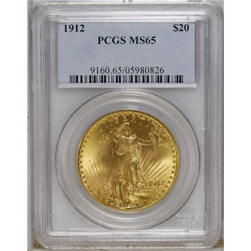 <B>1912 $20 MS65 PCGS.</B></I> This fully brilliant Gem has frosty olive-gold surfaces with hints of wispy rose toning. The surfaces are faintly abraded, although the marks that are visible remain strictly consistent with the MS65 grade. Gem quality examples of this issue are quite rare, especially when they are fully struck as this piece is. Dave Bowers noted: "In the context of double eagles of this era the 1912 is one of the scarcer issues. However, in absolute terms enough are around that you will have no difficulty in finding a nice one at, say, the MS-63 level. Gems are rare." With two Gem pieces in this sale, the present opportunity is quite remarkable. Population: 24 in 65, 4 finer (12/06).<BR><BR><b>Shipping:</b> Coins & Currency (<a target="_blank" href="http://www.heritageauctions.com/common/shipping.php">view shipping information</a>)
