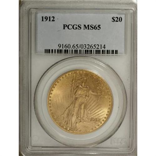 <B>1912 $20 MS65 PCGS.</B></I> Gold specialist David Akers indicates that the 1912 double eagle is the most common of the scarce Philadelphia Mint issues from 1908 to 1915. It is relatively available in Uncirculated grades through MS63. Near-Gem pieces are somewhat scarcer, and full Gem and finer examples are rare and seldom available. Akers' assertion is borne out by the PCGS and NGC population data. The two services combined have seen around three dozen MS65 specimens, and fewer than ten Premium Gem coins with none finer.<BR> The present Gem displays frosty honey-gold surfaces that show a slightly brighter appearance on the reverse, where the patination blends with tinges of lime-green. The design elements are exceptionally well impressed, with sharp delineation on the panes of the Capitol building, on Liberty's fingers and toes, and on the olive branch. Some minute marks on the torch and scattered over the reverse are mentioned for accuracy. Population: 27 in 65, 5 finer (12/07).<BR><BR><B>Coin Engraver:</B> Augustus Saint-Gaudens<BR><BR><b>Shipping:</b> Coins & Currency (<a target="_blank" href="http://www.heritageauctions.com/common/shipping.php">view shipping information</a>)