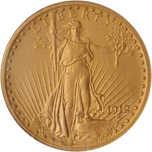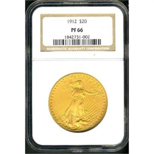 <b>1912 $20 St. Gaudens. NGC graded Proof 66.</b> Pop: 31/9. The finish of this piece is similar to the 1911 above. It differs slightly, however, in showing a more balanced mustard coloration over both sides, more neutral, as it lacks the overlay of olive shade seen on the 1911. As before, magnification opens up to the viewer myriad tiny sparkling diamonds from the sandblast process. This facet-sparkle gives the coin its unique sheen that serves as a perfect counterbalance to the crisp, sharp relief elements. The surfaces are not perfect but do come mighty close to perfection. A handful of Proof twenties were struck in 1912, 74 in all. The 1912 is roughly comparable in rarity to the 1911 and the other dates of the series (except for the 1908 which is the most plentiful).