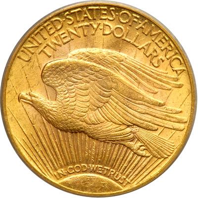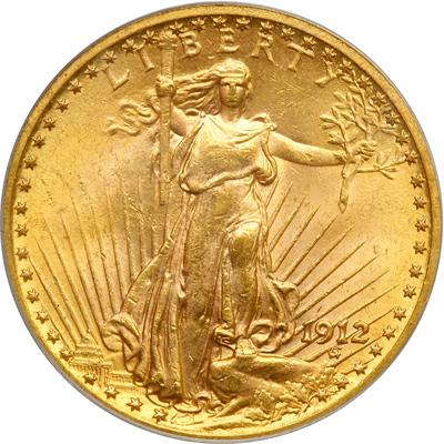 1912 $20 St. Gaudens. PCGS graded MS-63. A slightly better date. Lightly toned, both the peripheries and the central areas are impressive for their sharpness of detail, while the frosty textured surfaces are glistening (PCGS # 9160) .