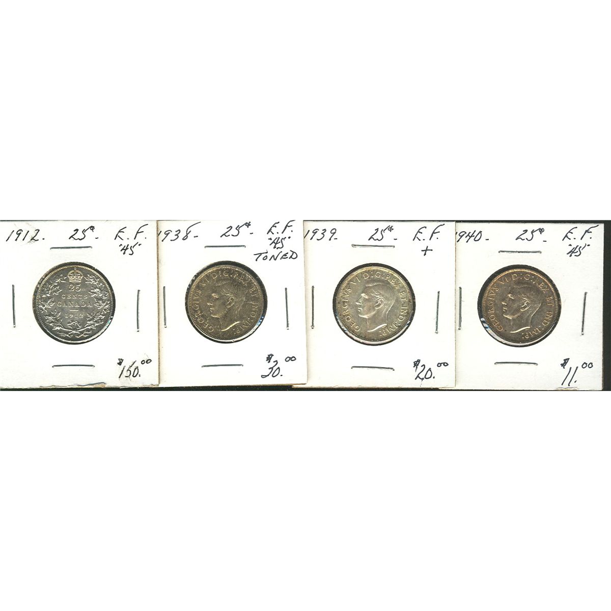 1912 25¢, 1938, 1939 & 1940. Lot of 3 coins all EF45. (PBA).
