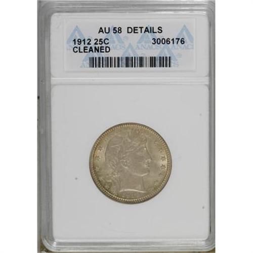 <B>1912 25C --Cleaned--ANACS. AU58 Details.</B></I> NGC Census: (25/273). PCGS Population (37/365). Mintage: 4,400,700. Numismedia Wsl. Price for NGC/PCGS coin in AU58: $140. (#5662)<BR><BR><B>Coin Engraver:</B> Charles E. Barber<BR><BR><b>Shipping:</b> Coins & Currency (<a target="_blank" href="http://www.heritageauctions.com/common/shipping.php">view shipping information</a>)