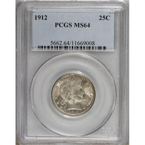 <B>1912 25C MS64 PCGS.</B></I> PCGS Population (126/81). NGC Census: (118/38). Mintage: 4,400,700. Numismedia Wsl. Price for NGC/PCGS coin in MS64: $460. (#5662)<BR><BR><b>Shipping:</b> Coins & Currency (<a target="_blank" href="http://www.heritageauctions.com/common/shipping.php">view shipping information</a>)