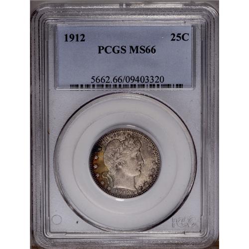 <B>1912<25C> MS66 PCGS.</B></I> Dove-gray, orange-russet, and apple-green blushes enrich this lustrous and exquisitely preserved Premium Gem. Any indifference of strike is limited to the fletchings and right (facing) claw. The 1912 is a common date in Mint State, by the difficulty standards of the Barber quarter series, but is undeniably rare above the MS65 level. Population: 13 in 66, 0 finer (2/06).