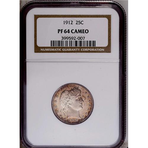 <B>1912<25C> PR64 Cameo NGC.</B></I> This lovely Cameo proof has exceptional contrast and is on the verge of qualifying for Deep Cameo status. A few faint hairlines and other minuscule imperfections limit the numerical grade, however, not the eye appeal. Each side exhibits a liberal amount of antique-golden patina that deepens toward the margins. Census: 8 in 64 Cameo, 20 finer (2/06).