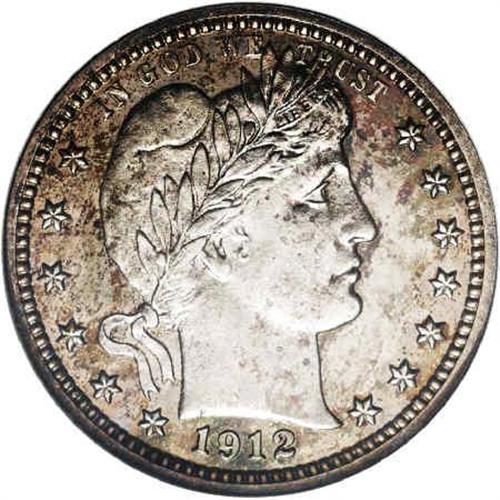 <B>1912<25C> PR65 NGC.</B></I> In addition to this specimen's peerless reflective surfaces, both sides are endowed with an enticing blend of speckled gold-brown, lavender, sea-green, lavender, and olive-green coloration. The design features are sharply impressed, and both sides are free of mentionable abrasions. From a mintage of 700 pieces. Census: 35 in 65, 36 finer (10/05).