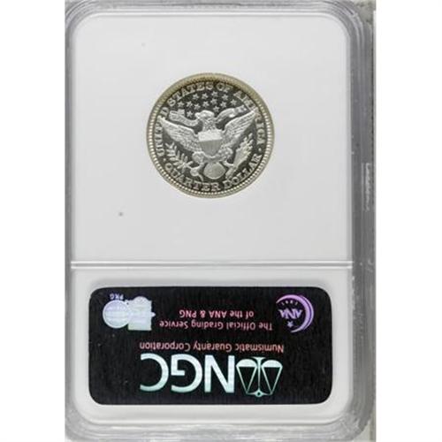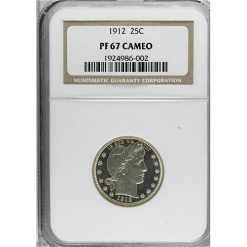 <B>1912 25C PR67 Cameo NGC.</B></I> An exceptionally attractive proof striking of this popular, late date in the Barber quarter series. Just the slightest overlay of rose toning can be seen on the obverse, and the reverse is essentially brilliant. The cameo contrast is stark on each side with thick, frosted devices set against the illimitable depth of mirrored reflectivity in the fields. Census: 5 in 67, 2 finer (5/07).<BR><BR><b>Shipping:</b> Coins & Currency (<a target="_blank" href="http://www.heritageauctions.com/common/shipping.php">view shipping information</a>)