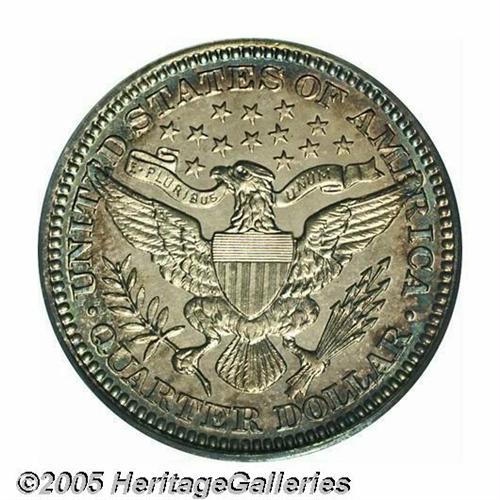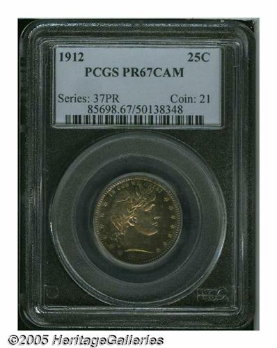 <B>1912<25C> PR67 Cameo PCGS.</B></I> Only 700 proofs were struck of this later date issue. This is a spectacularly toned example that is covered in variegated multicolored iridescence. The deeply mirrored fields enliven and brighten the colorful toning considerably and there are no obvious surface flaws on either side of this pristine proof Quarter. Population: 1 in 67, 1 finer (5/05).