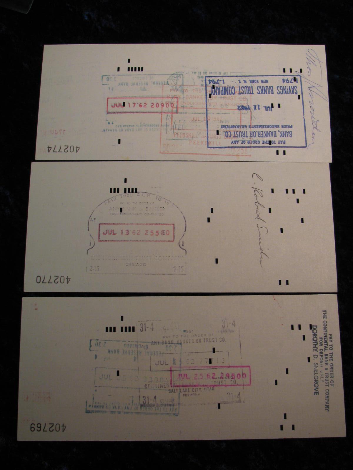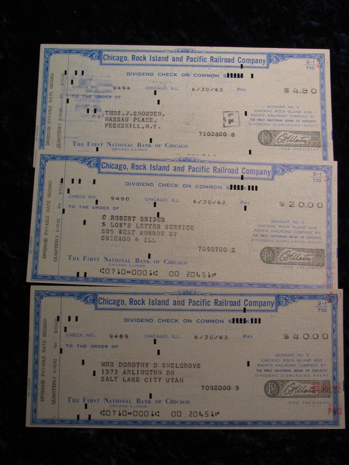 1912. (3) 1962 Chicago Rock Island & Pacific RR. Checks. Dividend Check on Common Stock.