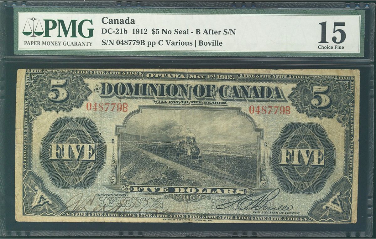 1912 $5 DC -21b #048779B PMG CH F15. Very scarce variety, seldom offered.