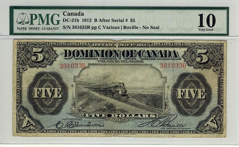 1912 $5 DC-21b #361633B PMG VG10. Scarce variety.