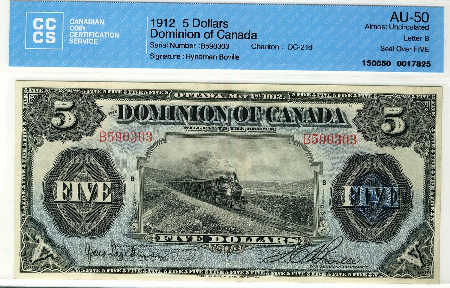1912 $5 DC-21d #B590303 CCCS AU50, a nice example.