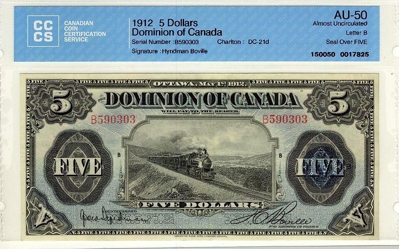 1912 $5 DC-21d #B590303 CCCS AU50, scarce issue.