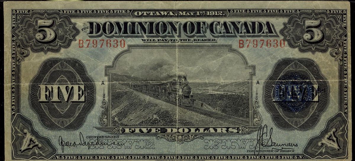 1912 $5 DC-21e #B797630 Seal over Five, Saunders F-15