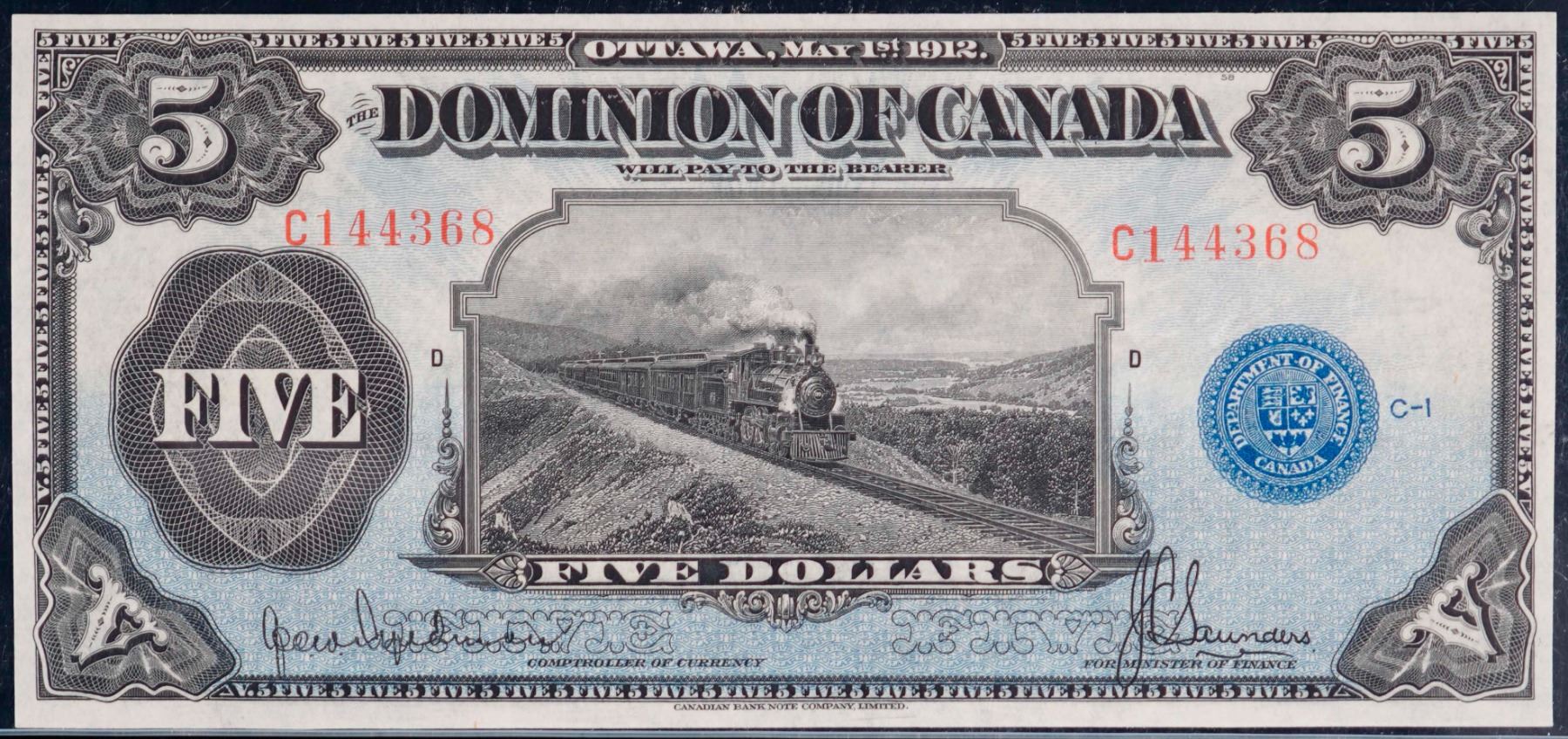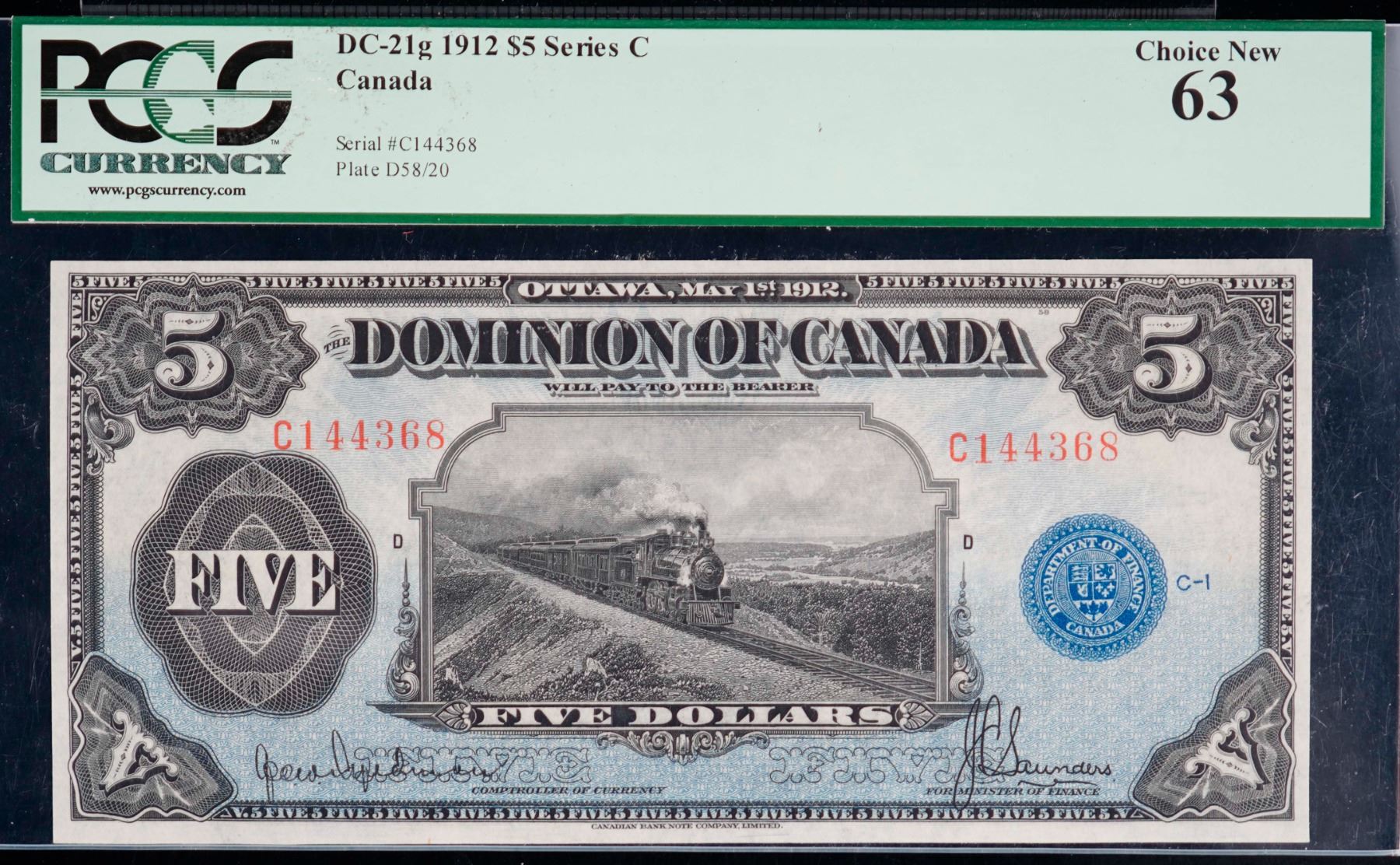 1912 $5 DC-21g #C144368, PCGS Choice Uncirculated-63. This is a choice issue with great eye appeal, good margins and vibrant colours.