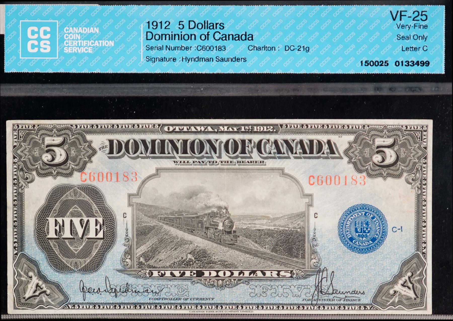 1912 $5 DC-21g #C600183 Hyndman-Saunders "Seal Only" CCCS Choice Very Fine-25