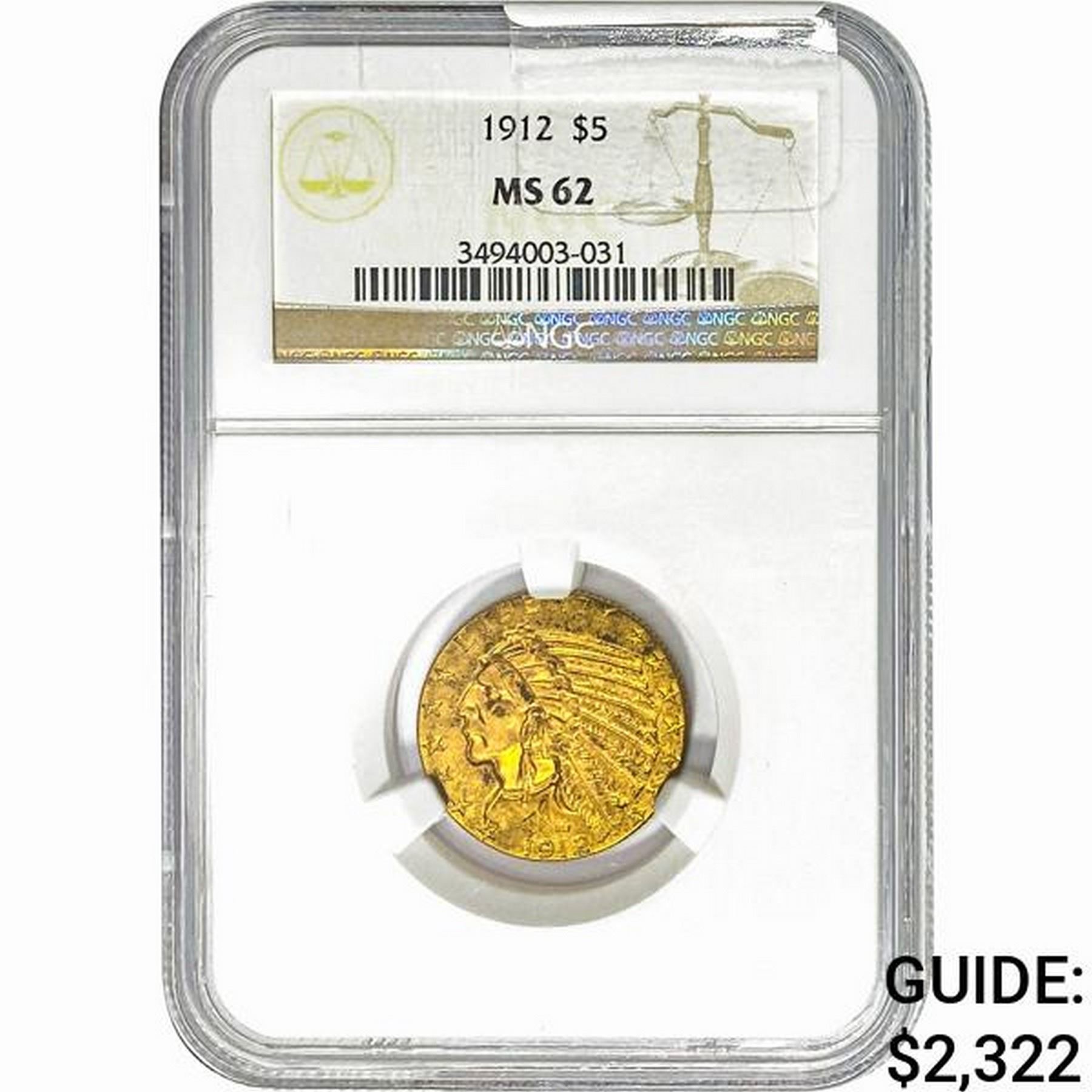 1912 $5 Gold Half Eagle NGC MS62