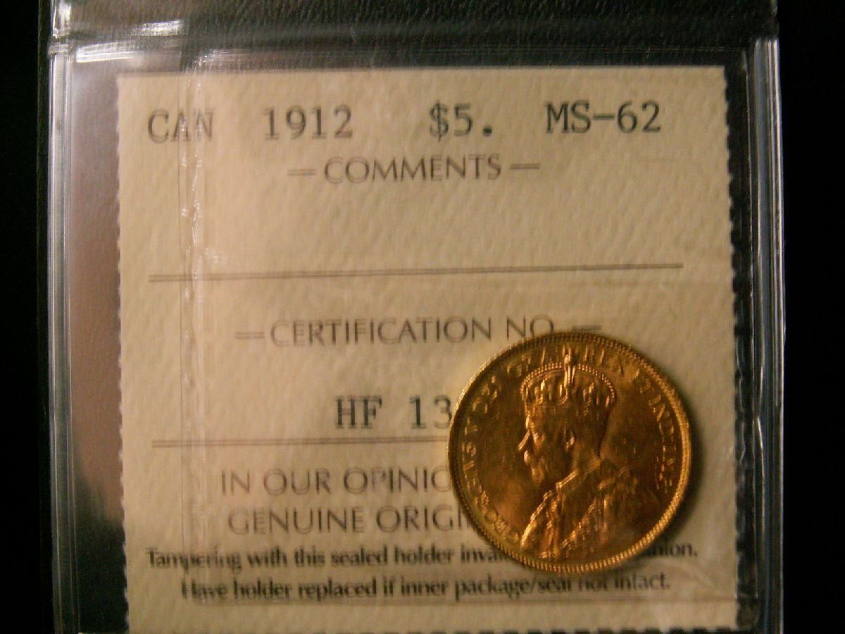1912 $5 Gold ICCS MS62. Lots of lustre.