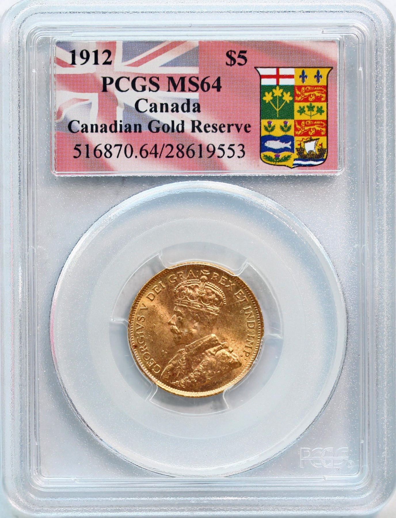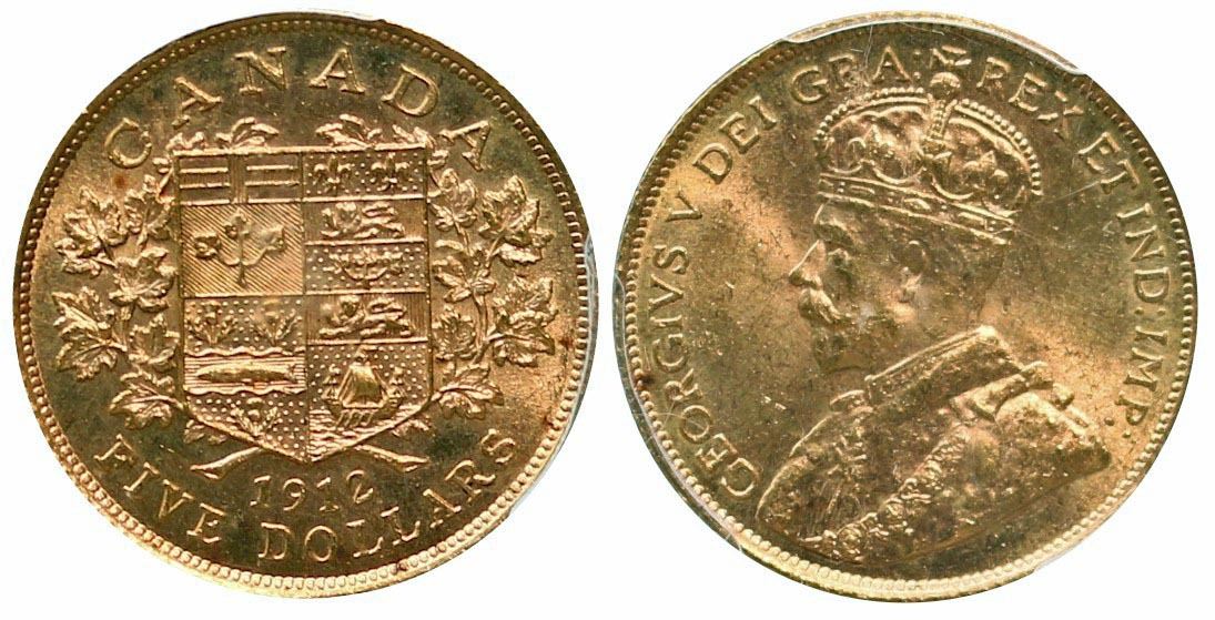 1912 $5 Gold PCGS Choice Mint State-64. Lustrous issue from the Canadian Gold Reserve.