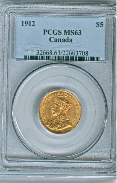 1912 $5 Gold PCGS MS63, strong lustre with good eye appeal.