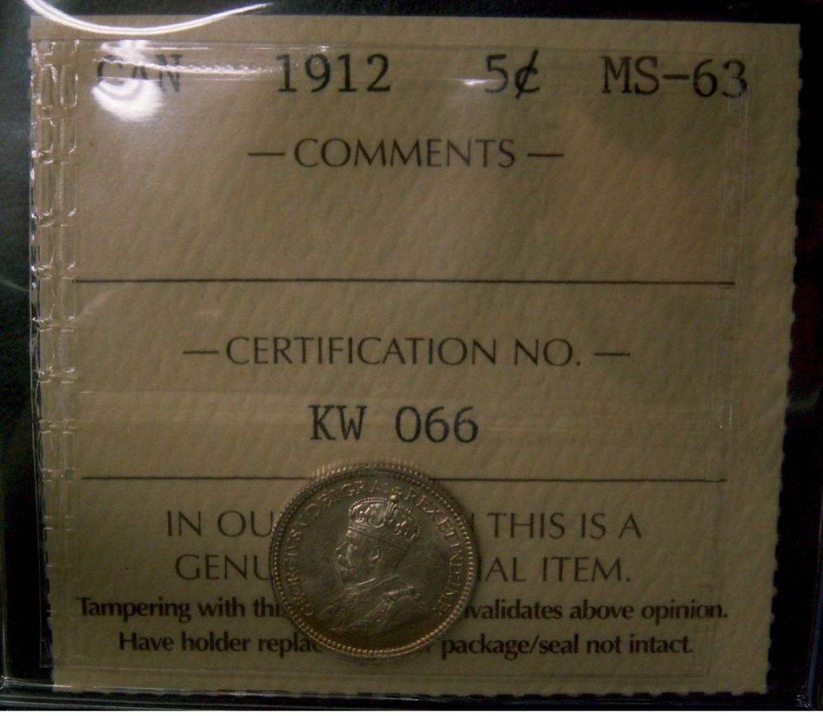 1912 5¢ ICCS MS63. Lustrous white example with hint of gold tone.