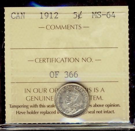 1912 5¢ ICCS MS64, mostly brilliant. Hint of golend toning. Flashy!