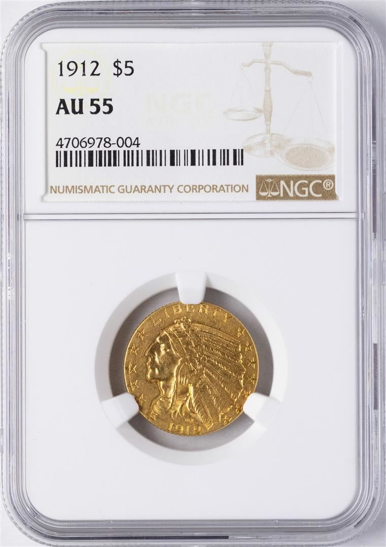 One 1912 $5 Indian Head Half Eagle Gold Coin NGC AU55. NGC Certified.