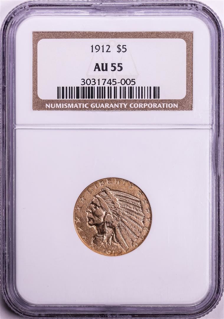 One 1912 $5 Indian Head Half Eagle Gold Coin NGC AU55. NGC Certified.