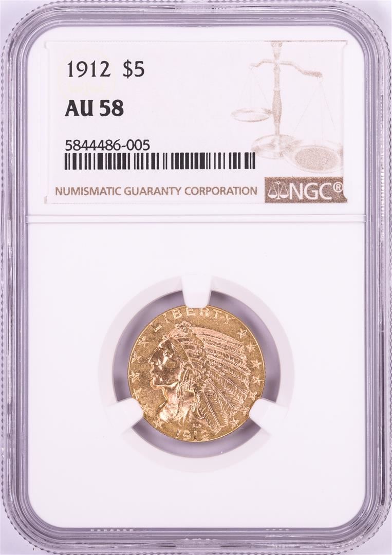 One 1912 $5 Indian Head Half Eagle Gold Coin NGC AU58. NGC Certified.
