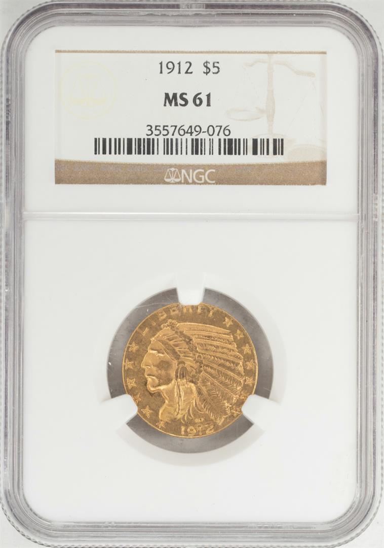 One 1912 $5 Indian Head Half Eagle Gold Coin NGC MS61. NGC Certified.