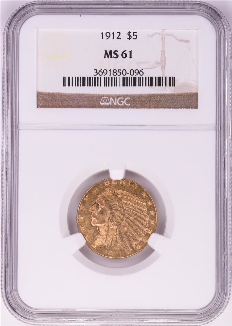 One 1912 $5 Indian Head Half Eagle Gold Coin NGC MS61. NGC Certified.