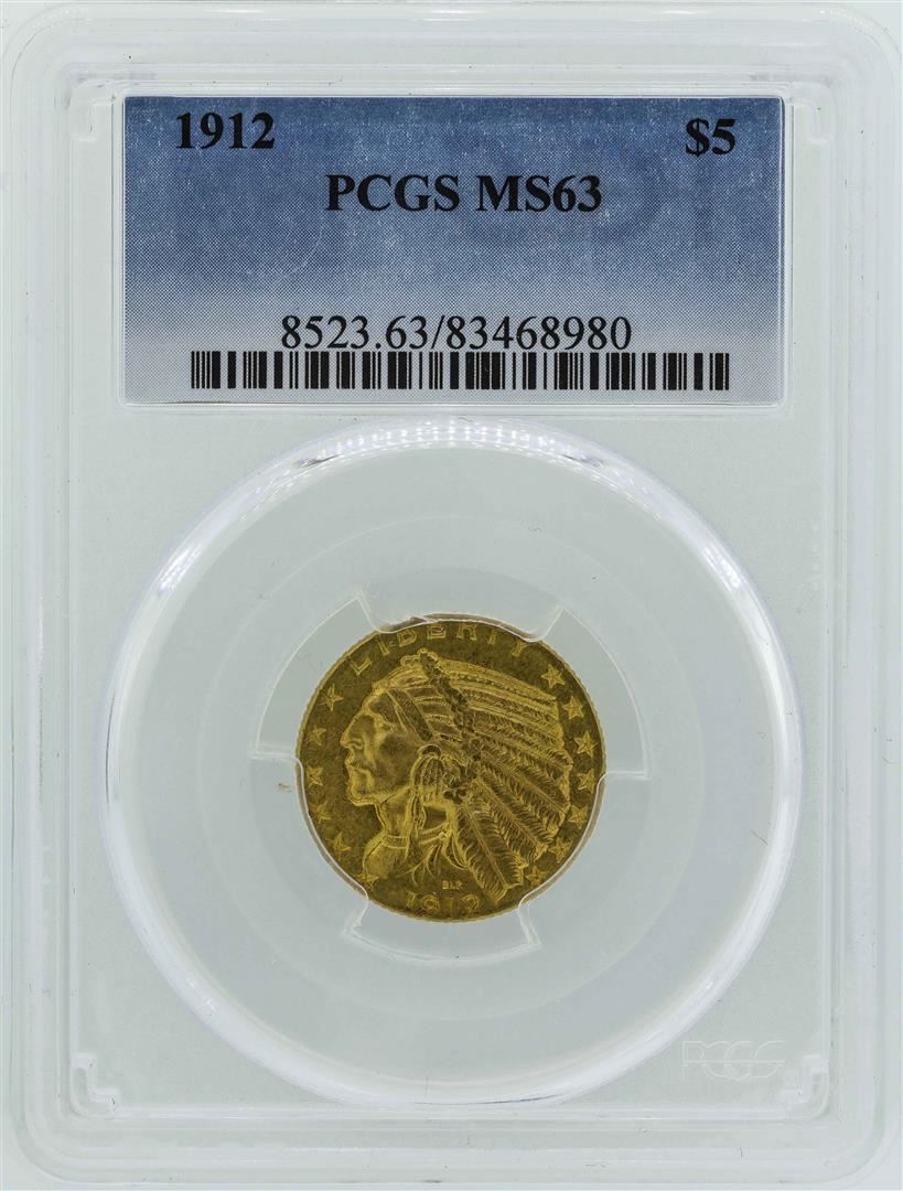 One 1912 $5 Indian Head Half Eagle Gold Coin PCGS MS63. PCGS Certified.